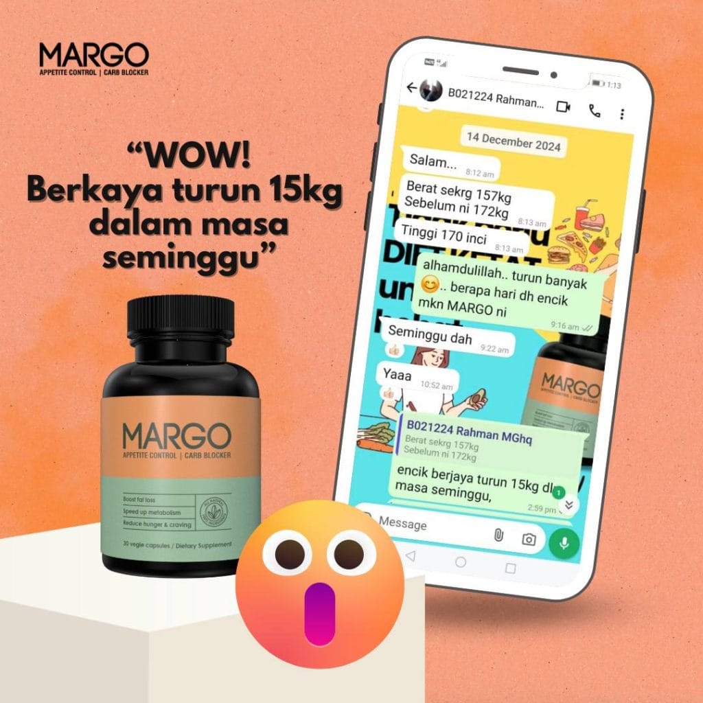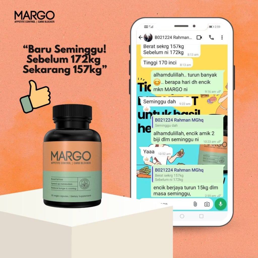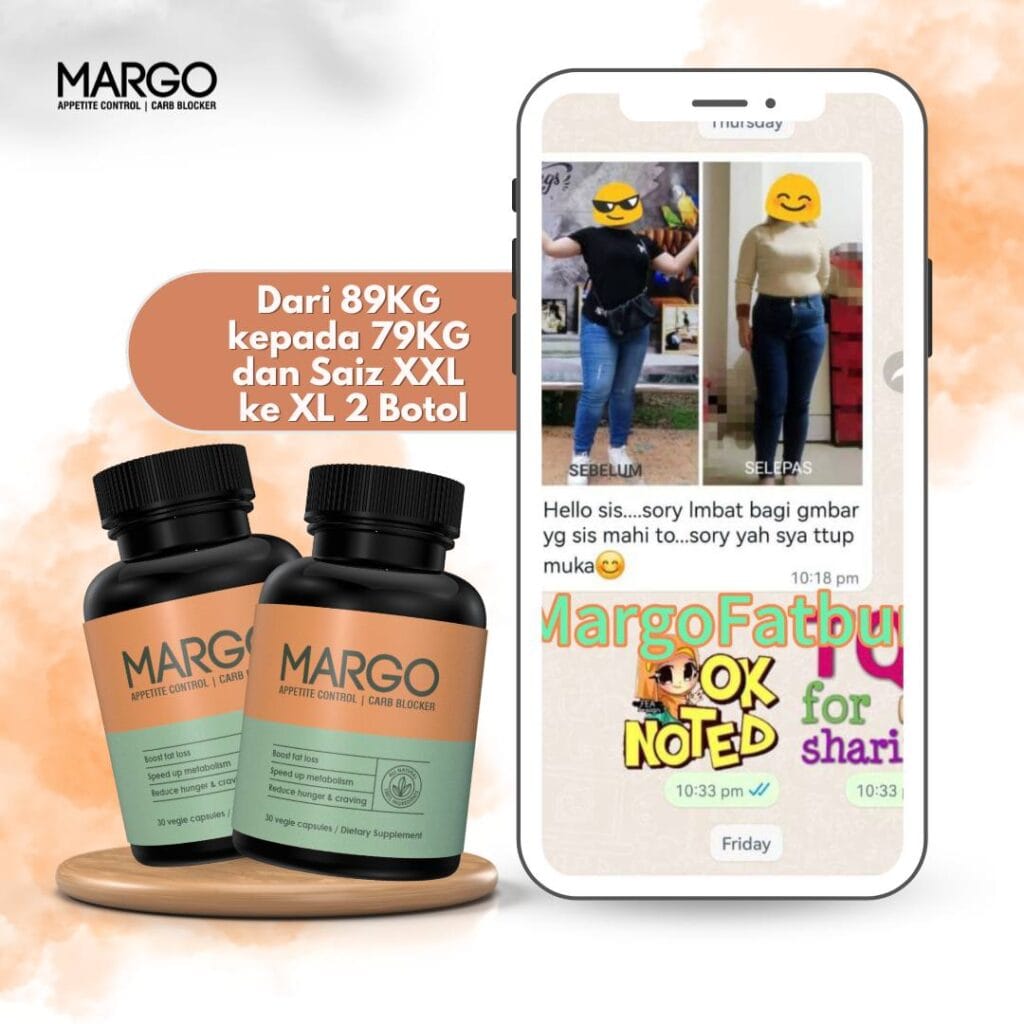 Mesti abang akak sudah penat mencuba pelbagai cara untuk menurunkan berat badan tetapi masih gagal? Dah bosan dengan perut buncit dan selera makan yang sukar dikawal? Kini abang akak tidak perlu lagi risau. Dengan MARGO FATBURN CAPS, impian untuk badan langsing dan sihat bukan lagi khayalan.
